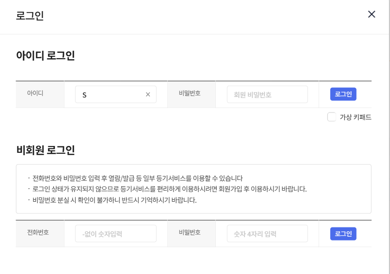 회원인 경우 회원 아이디 비번을 입력한다.