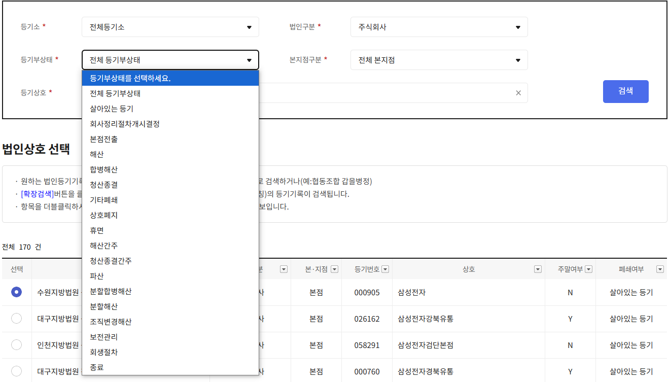 살아 있는 등기, 해산, 합병,청산 된 등기 인지 선택하면 된다.