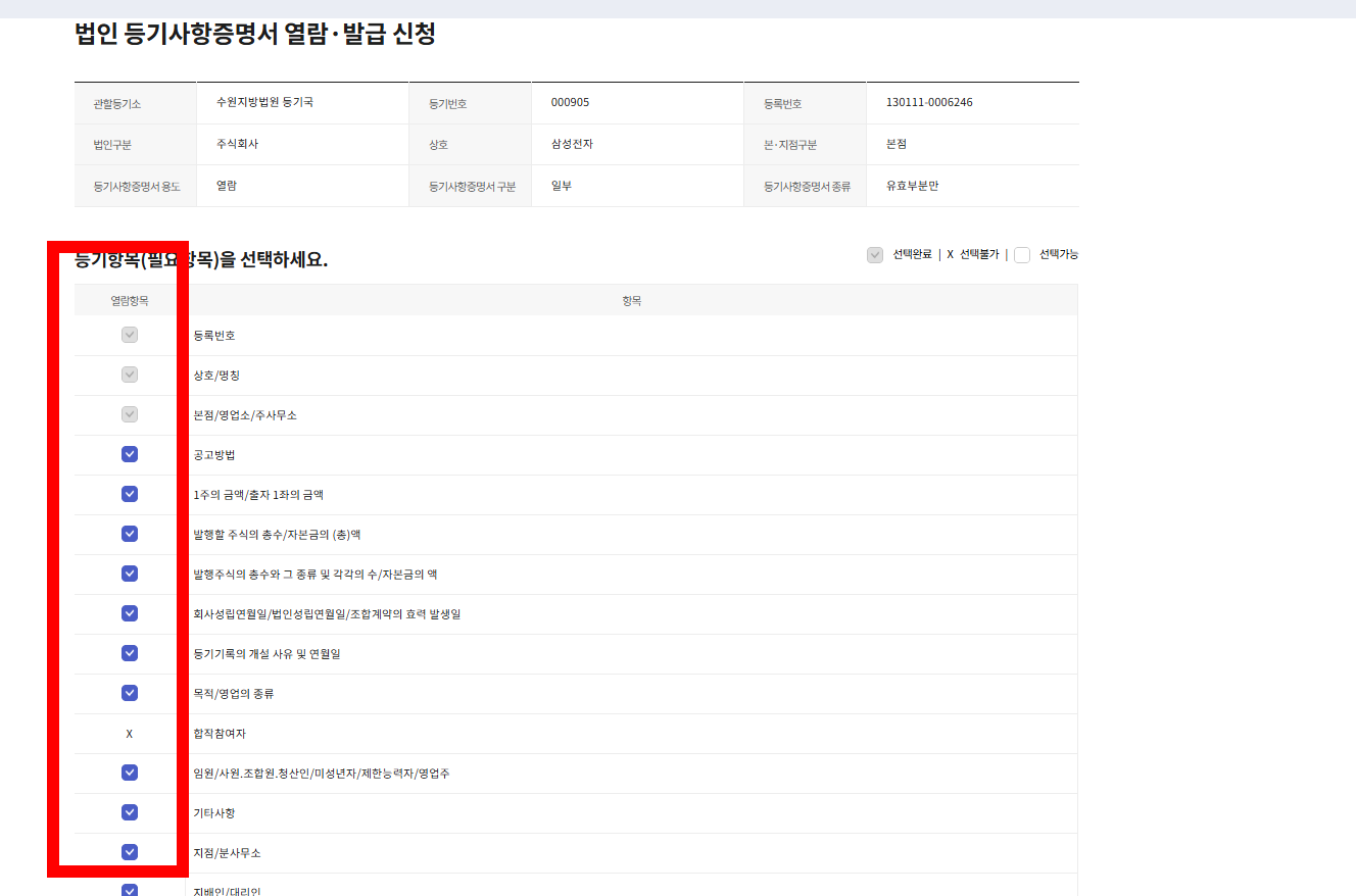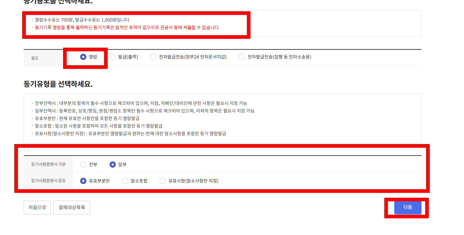 등기 항목에 필요사항을 박스 체크 하고 다음을 클릭한다.