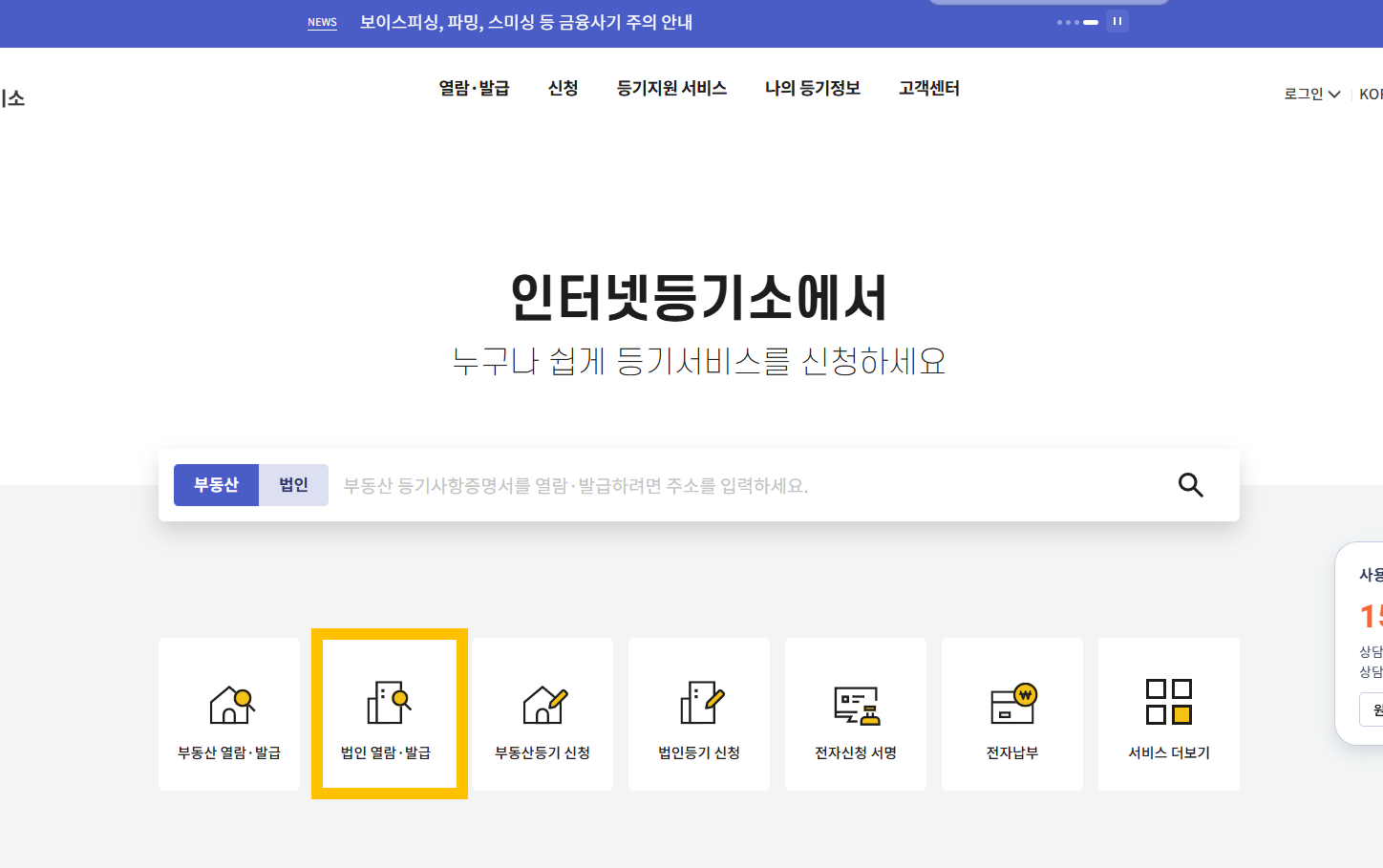 인터넷 등기소에 접속한다.