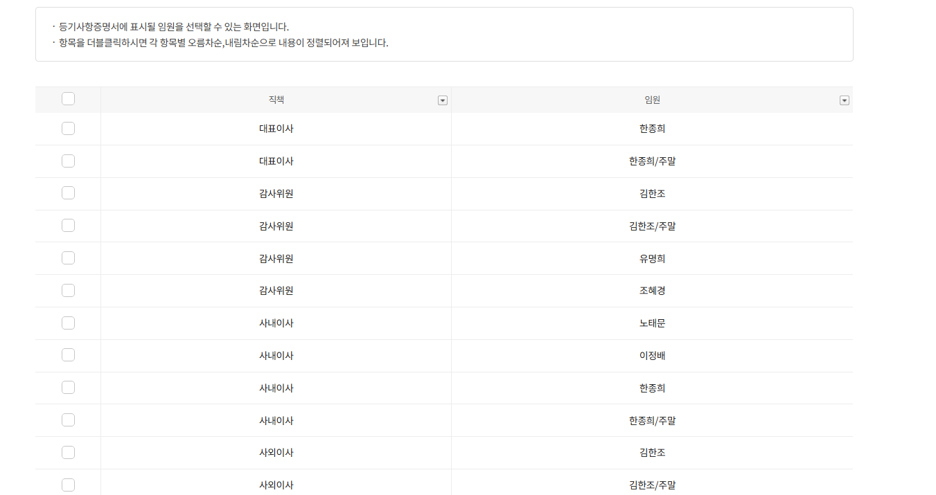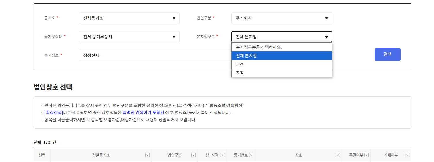 법인 구분은 주식회사, 합자회사, 합명회사, 유한회사등 찾고자 하는 법인을 선택한다.