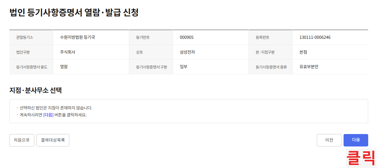 법인 열람 발급 버튼을 클릭한다.