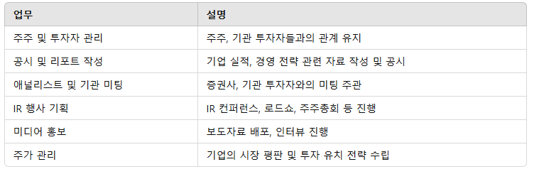 대기업 및 상장사는 대부분 IR을 전담하는 부서를 운영합니다. 주요 업무는 다음과 같습니다.